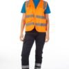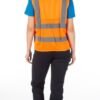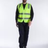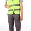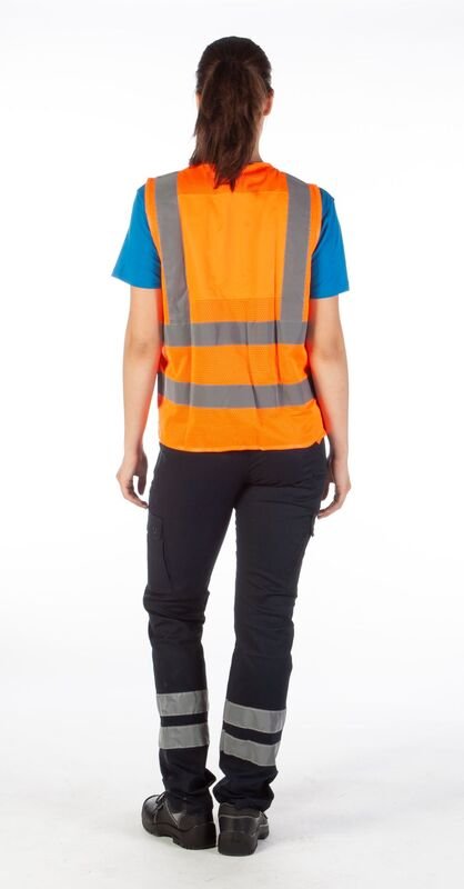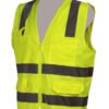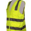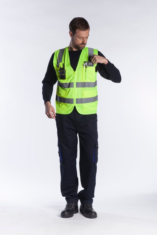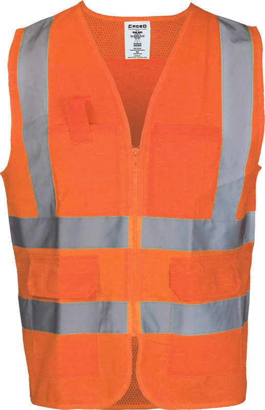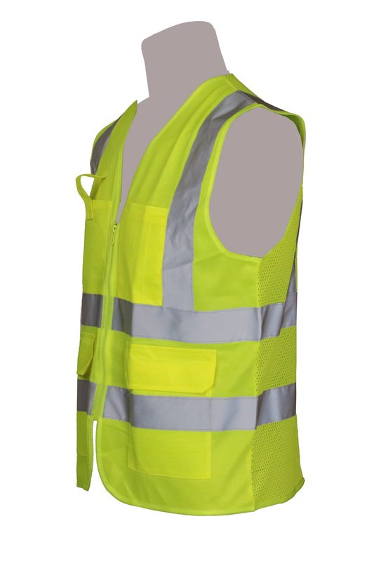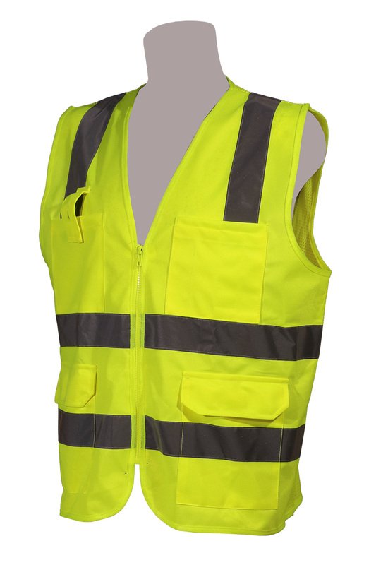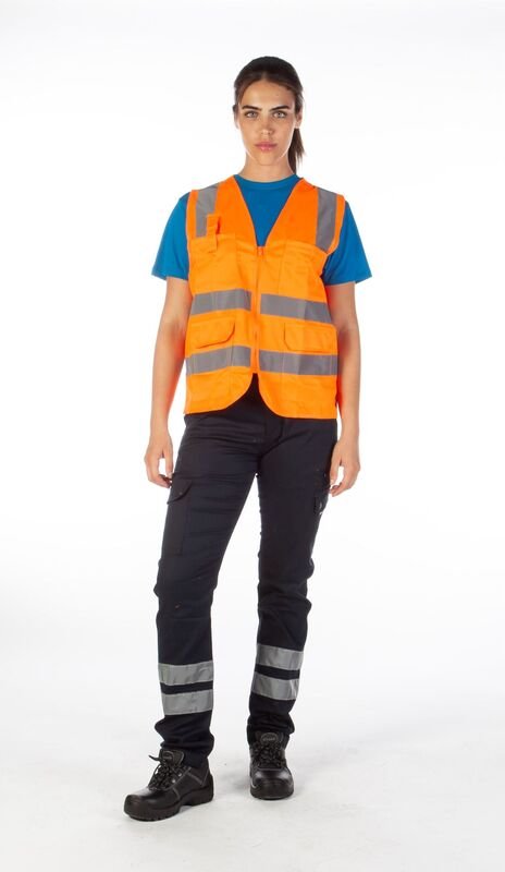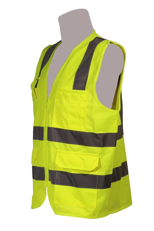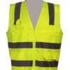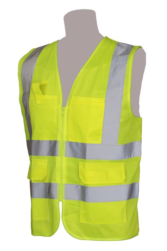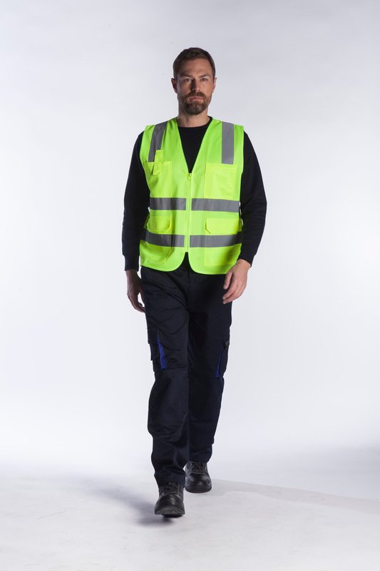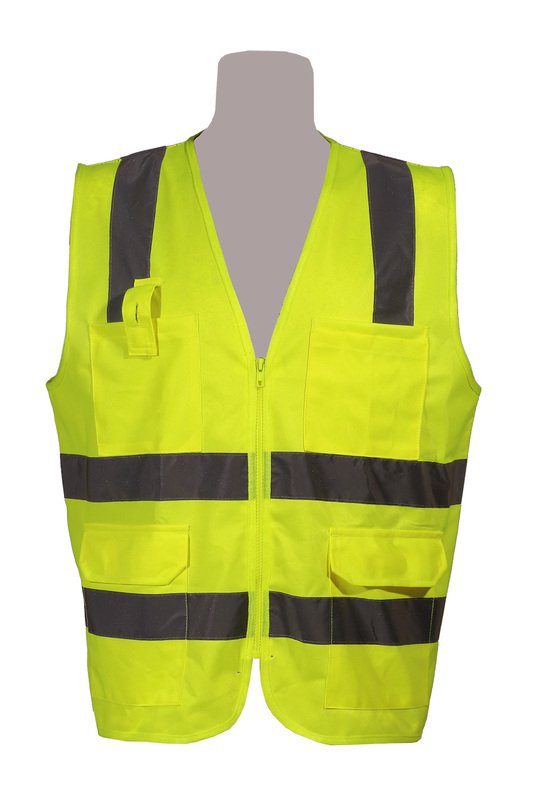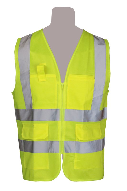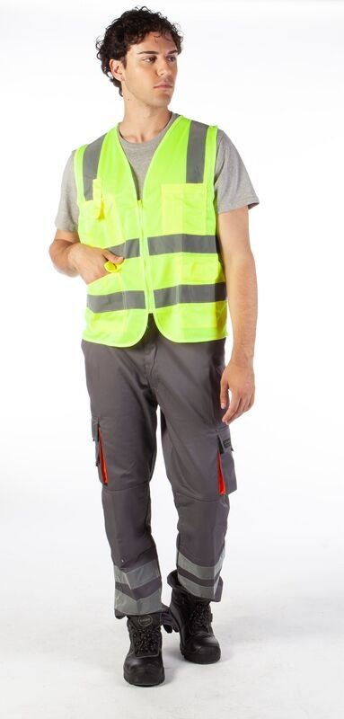 Γιλέκο υψηλής ευκρίνειας με ανακλαστικές ταινίες 5cm (οριζόντιες και κάθετες) , κεντρικό φερμουάρ και 4 τσέπες μπροστά .