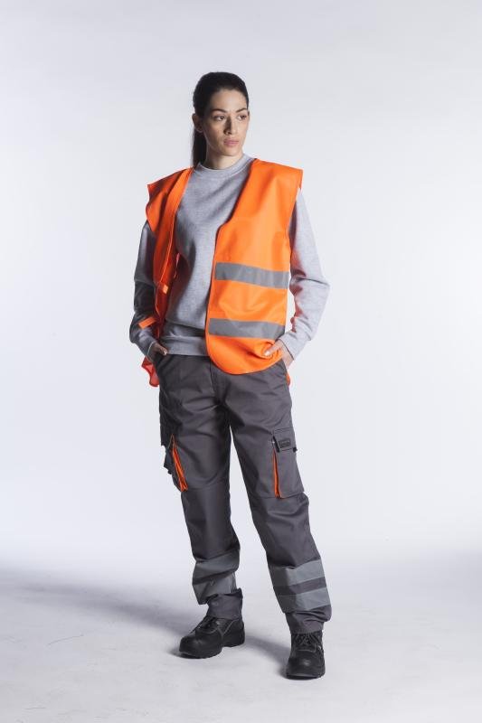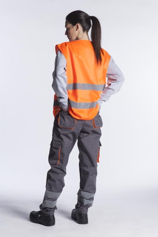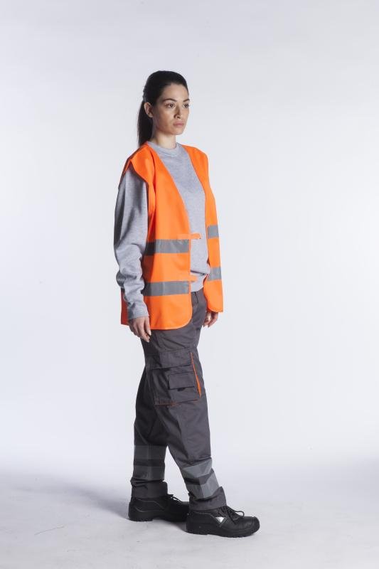 Γιλέκο υψηλής ευκρίνειας με ανακλαστικές ταινίες 5cm και οριζόντιο velcro που προσαρμόζεται από L έως XXL .