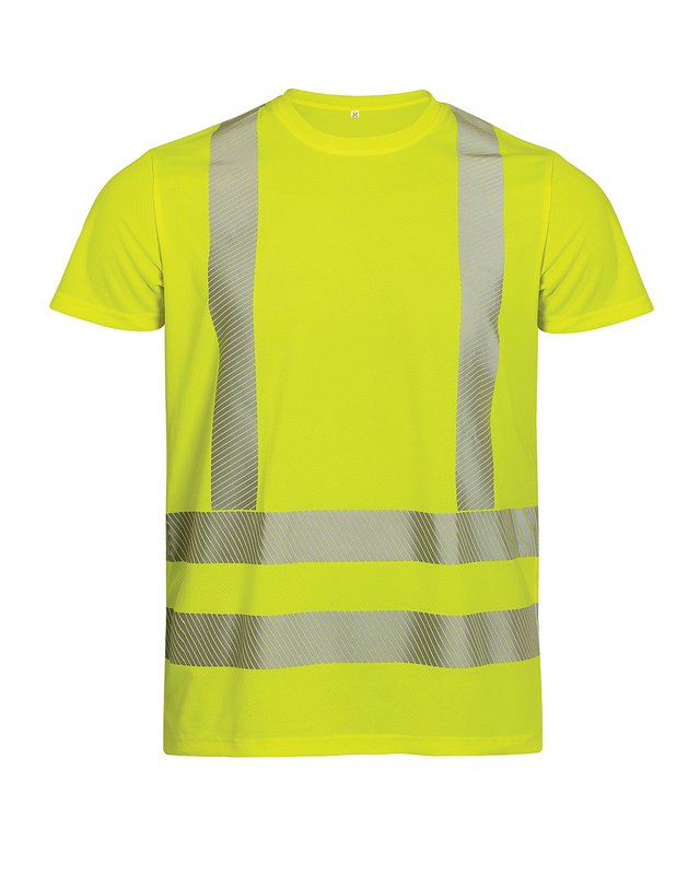 Μπλουζάκι φωσφορούχο,πολυεστερικό, με στρογγυλή λαιμόκοψη και  με 4 τυπωμένες ανακλαστικές ταινίες των 5εκ., δύο οριζόντιες και δύο κάθετες,